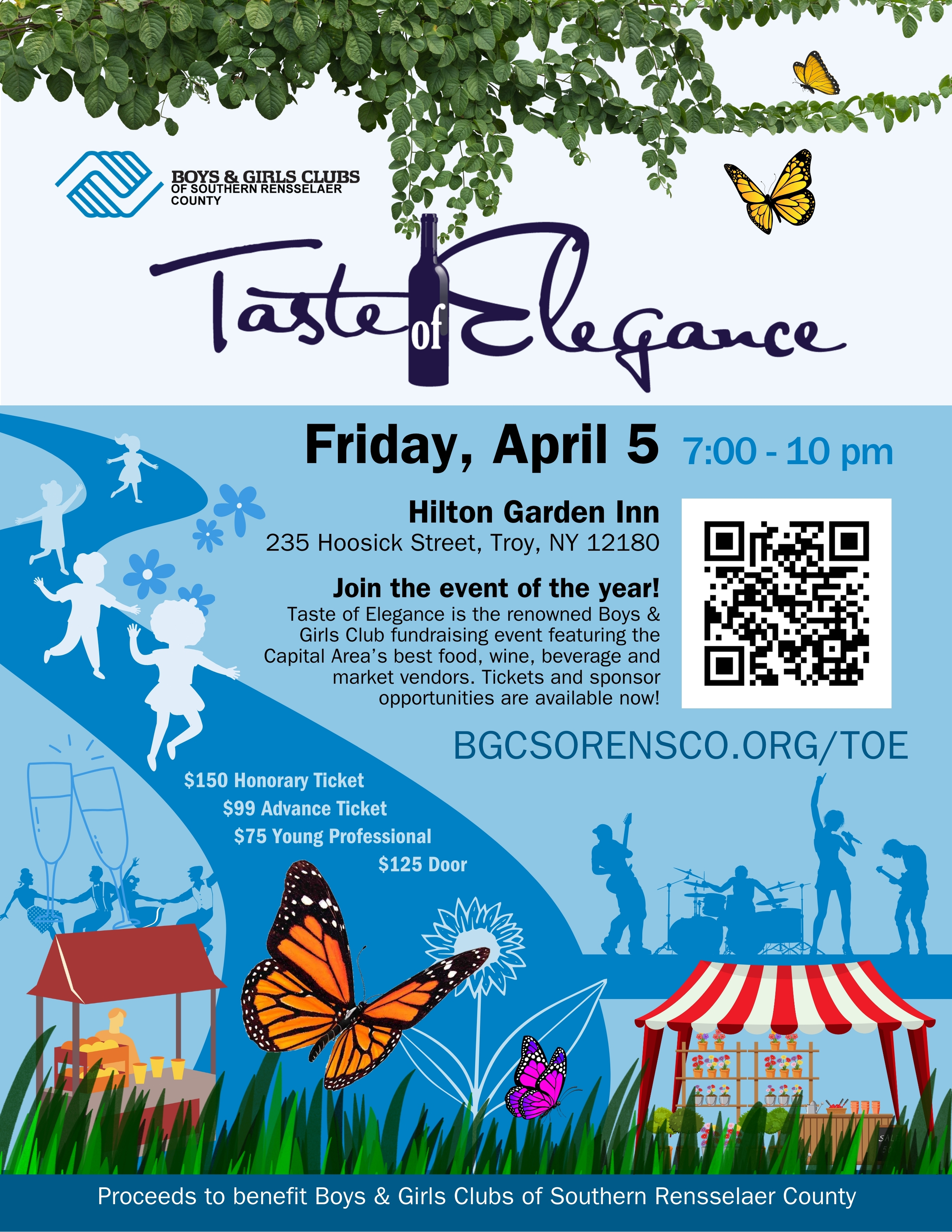 Taste of Elegance will take place place 7:00-10:00 pm at the Hilton Garden Inn, 235 Hoosick Street, Troy. Sponsorship opportunities are now available (see below).