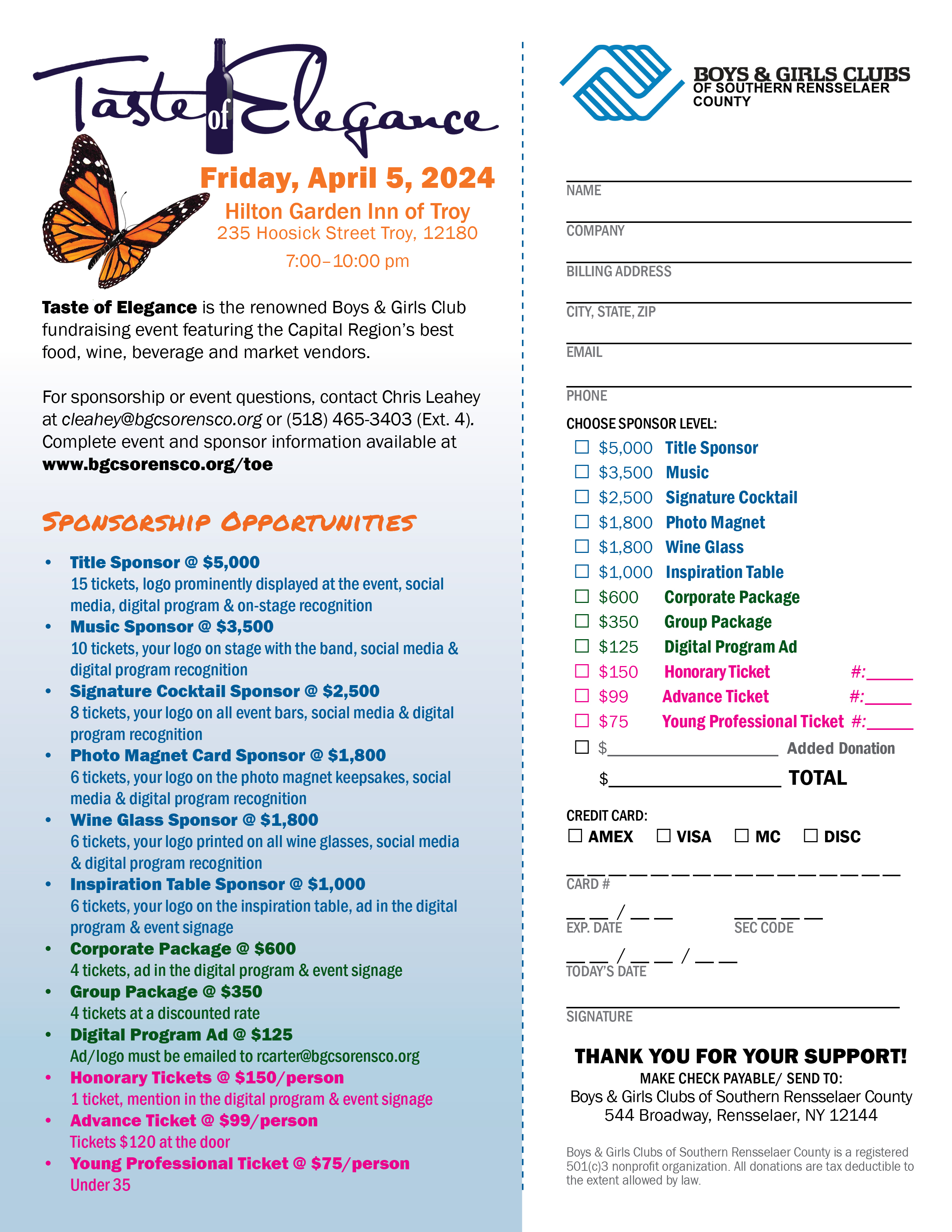 For sponsorship questions, please contact Chris Leahey at cleahey@bgcsorensco.org or (518) 465-3403 x4.